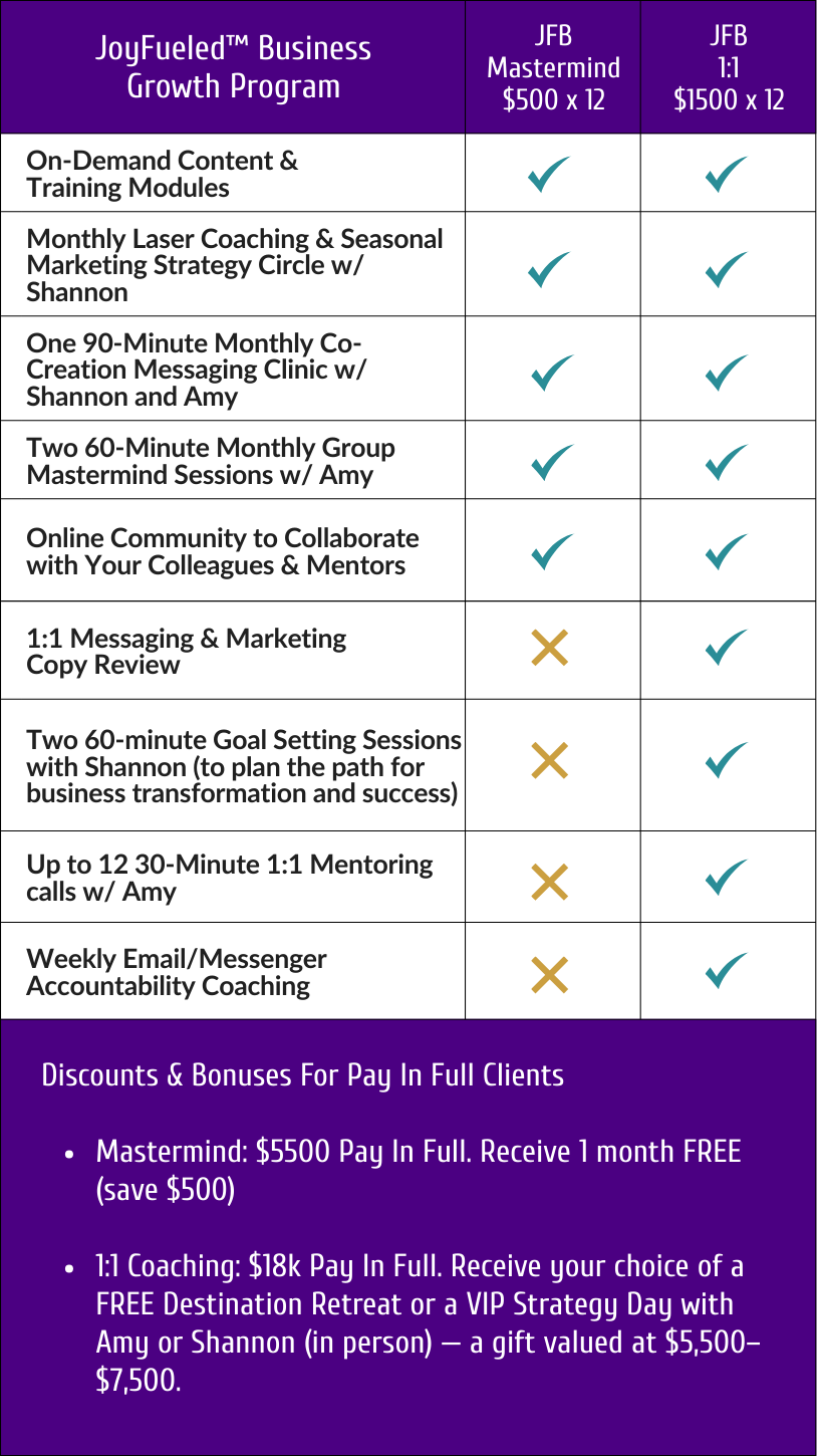 Because Shannon and Amy have both experienced the many benefits of spending more time in our joy each and every day, as well as using JOY AS THE FUEL for business growth. Those benefits include relaxation, play, travel, and letting our busy minds rest. The unexpected upside of prioritizing joy has been more brilliant ideas for our businesses and more revenue generated in ways that surprised and delighted us! We believe the more we say yes to joy, the more impact we have, and the money we make.